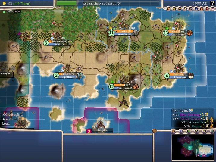 By 1000AD, I've already grabbed the lead in score and am only going to extend it further from this point. Out in front in tech, London has a ridiculous accumulation of wonders, popping lots of great people, etc. Game's already over in terms of the outcome, but it should make for a decent draft test.