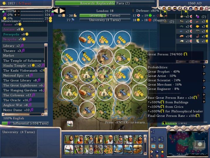 London cranking away as I research Replaceable Parts on the path to Rifling (I already used the free Liberalism tech to grab Nationalism). Nothing like seeing 26 Great Person Points "+100% from Buildings" "+100% from Civics" "+100% from Philosophical" = 104 points/turn. Researching at a pretty good clip too.