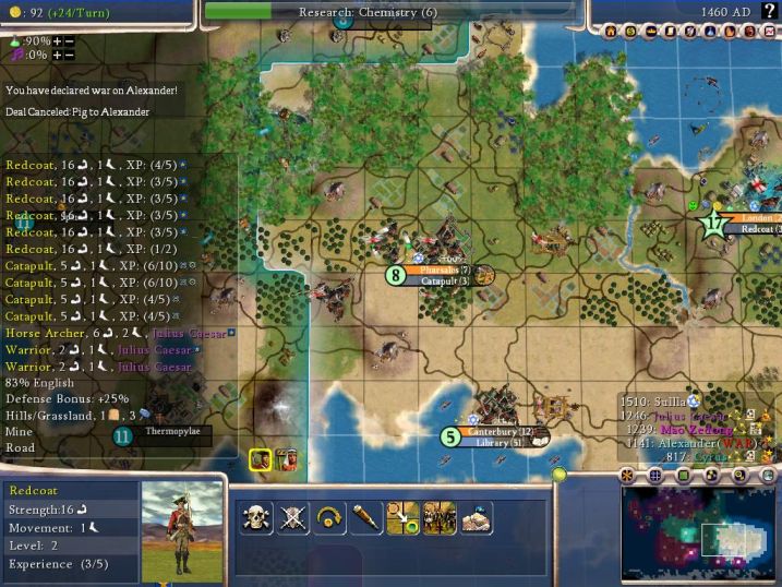 I was ready to go by 1460 - that's just 5 turns after I drafted for the first time, and 6 turns after discovering Rifling. Wow! With the exception of the 4XP Redcoat, all the others are conscripts (the one with 1XP came from Canterbury, which has no barracks). I declared war on Alex and proceeded to mow through his cities very quickly. He still had all medieval units (no muskets), which my Redcoats just laughed at. To his credit, Alex smashed my stacks with cats where possible, though the only stacks I was forming were the ones needed to guard my siege units. He did a pretty competent job - he was just badly overmatched. The war was a complete steamroller operation and not worth mentioning.