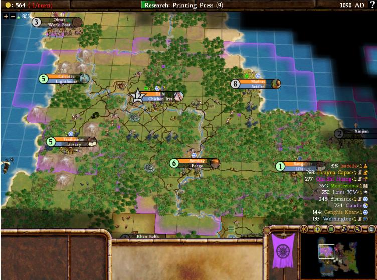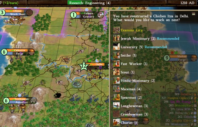 By 1090AD, I had recovered pretty well from my initial struggles. I had founded a couple more cities and my units had been fighting a long engagement with the barbs in the north, taking several of their cities. On this particular turn, I had just discovered Education first and taken Machinery with it, as well as swapping into Bureacracy for the first time. Here, I'm also building Chichen Itza, by far the most important wonder for this game. I would eventually get it in 1210AD: