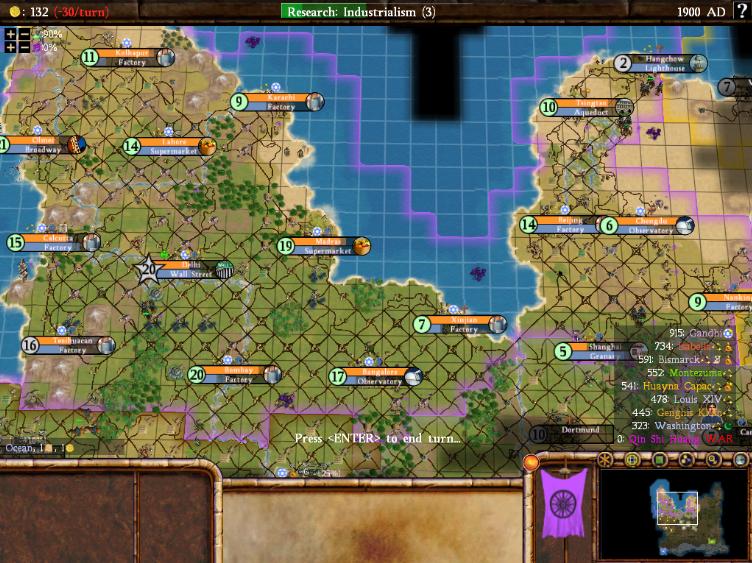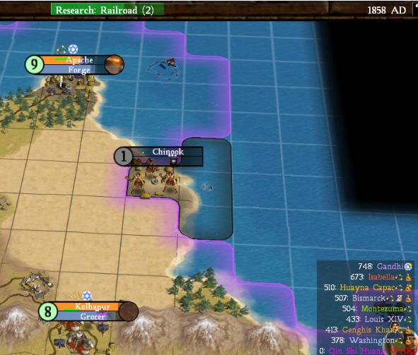 In any case, after absorbing China I had the most cities and land by a large margin and I began to leave the other AI civs in the dust. My score, which had been in last place after Temujin's early sneak-attack, jumped far out in front by a satisfying margin. Here's where my civ stood in 1900AD: