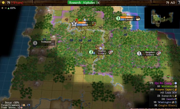 This was my situation in 75AD, shortly before I changed my state religion. I've founded Bangalore in a location where every single tile is jungle. This was not so great for the short run, but I had plans for it down the road, and I wanted to see how strong such a jungle city could be in the endgame. It was all but useless for hundreds of years; I'll return to it later on in this report. A barb city had popped up on the site of the former Turfan, which I would eventually conquer and add into my dotmap. There were so many barb cities around me that I ended up conquering as many cities as I founded. More on barb cities and barbs in general in a minute. After researching the religious techs and then getting the necessary worker ones, I had grabbed Bronze and Iron Working to be able to cut down the jungle. Now I've returned to the top of the tree for Alphabet to enable tech trading, which I would use to catch up on some of the backwards techs I skipped. Overall, I think I made some pretty sound choices early on.