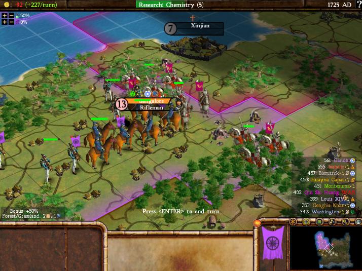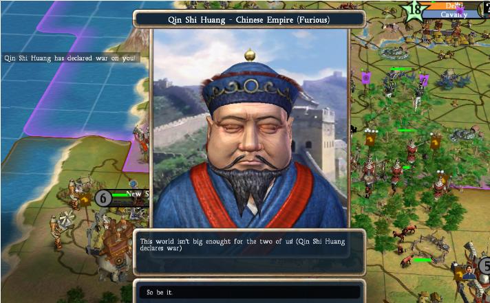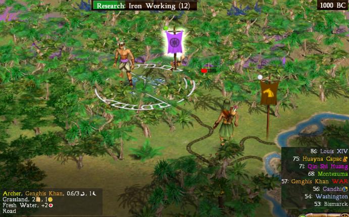 (Side Tangent) - The AI civs are not fighting each other enough. The ONLY AI vs. AI fight that didn't involve me in some way was the super-early fight between Temujin and Washington, and that was probably because Temujin seems to fight EVERYONE in this game. This really needs to be changed before the game is finalized, because otherwise we're moving back into "human versus the world" again, and that is definitely not good. One of the things I liked in Civ3 was that the AI civs would indeed fight each other; they were clearly competing with one another as much as with the human. If we don't have that element in Civ4, it will be a step backwards. As it stands now, the AI civs basically sit and build forever in peace unless the player does something to change that. This needs to be fixed. (End Tangent)