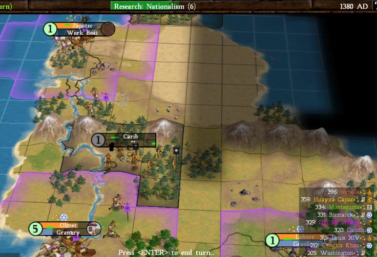 Carib was a huge pain in the rear, sabotaging my efforts to run a road up to Zapotec. Now I can understand barb cities in that fogged area to the right, but they really shouldn't be appearing in areas that I could see. Having to deal with three archers out of nowhere, right on top of one of my cities, was also not cool. The rate at which cities was forming was also ridiculous; I killed off a city and literally two turns later it was back again on the same tile. That's just stupid. This definitely needs to be addressed in some way before release, or otherwise we're going to look silly. But again - keep the random barbarians in place, since they're working just fine.