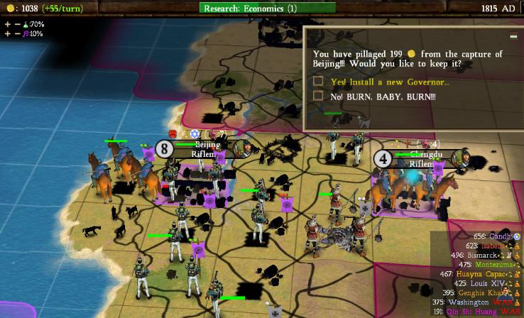Eventually I ran over Beijing as well, and after that it was just mop-up work. (Not sure what's up with the black graphics in that shot; it fixed itself in a number of turns). The challenge level seemed to be about right; I had to work pretty hard to conquer China, but I had a stronger economy and a tech lead, so it was doable. War weariness also seems to be about right from what I experienced. China finished in 1858AD. The next post will go into the ending details.
