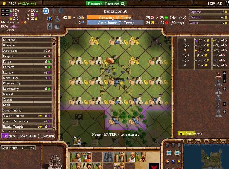 The other big tradeoff on this strategy is that all those cottages result in some cities that tend to be shield-poor. It takes a long time to build anything, and cash-rushing is often the best way to go. Chichen Itza would practically be a must. Theocracy really helps for cities that have the state religion, just because shields are in such a short supply. The other problem is that without lots of farms, there won't be that many great people popping up. I had about six or seven in this game, which certainly isn't a lot. The big, BIG strength is that no one is going to be able to out-research someone who is running all those cottages. Combined with upgrades from all the cash that one is running, it could be militarily powerful. Look what I was able to do with Bangalore at the end of the game: