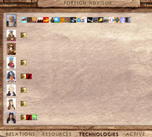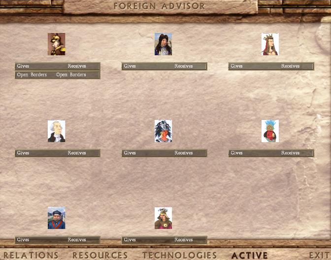 One of the things I focused on in my previous game was the diplomatic AI, and I was taking notes on it again here. The tentative conclusion that I've come to is that the diplo system does, in fact, work but that in v.57 it was being sabotaged by the idiotic demands of the AI civs. Early on in this game, I found that the AI civs were dividing into two camps with regards to their relations to me. There was a group that was willing to sign Open Borders agreements with me and start trading techs and resources (Washington, Bismarck, Huayna Capac). There was also a group that were sourpusses and wanted nothing to do with me (Isabella, Montezuma, Louis, Qin). Temujin was on his own and would having nothing to do with anyone, which seems to be his AI personality in Civ4. Early on, this system was working great and the world was dividing into two trading blocs, which I think is what we want.