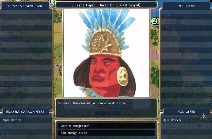 As it stands in v.57, the player basically cannot make any friends who have a different religion than their own. This is partly due to the fact that you enjoy a relations boost with civs of the same religion, but more due to the fact that when a civ does NOT share the player's religion, that civ will constantly demand that the player swap religions - sending relations into the toilet. Case in point for this game was Huayna Capac. The Incan leader was my friend all throughout the early turns, and we consistently were trading techs and resources. But over time, since he was Buddhist and I was in Judaism, relations inevitably declined as he demanded I change my religion.