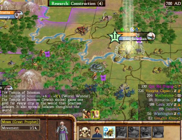 In my previous game, I had failed to get any Great Prophets and thus never was able to build a shrine for my state religion. In order to avoid that, I had Bombay run a priest specialist for about 20 turns to ensure that my first Great Person was a Prophet. Here you see Moses about to build the Jewish Shrine (ha! what a coincidence!); I really like the new light effect for the prophets, by the way. In reading the other reports, I saw that Sirian built the Oracle and used the free Great Person points from it to generate his Prophets. That seems like a strong move I'll have to try down the line. But seeing as how this was only my third game, I wasn't quite aware that such things could be done.