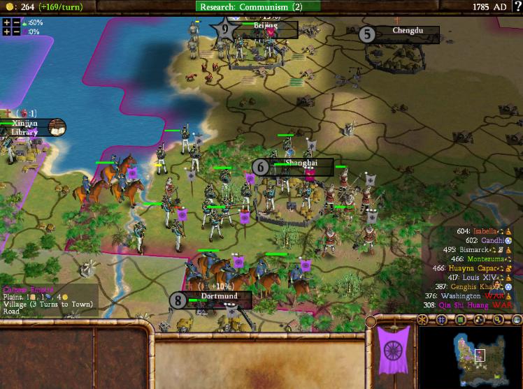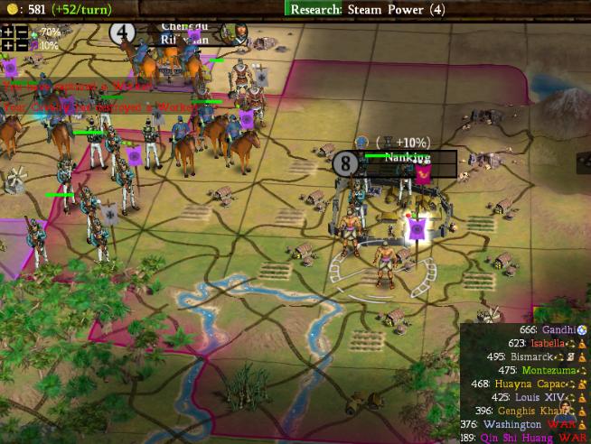 What touched off Qin? Our relations hadn't been good, but I think that Temujin may have actually signed him into the war against me. If so, and it wasn't just a coincidence, it would be a very strong performance from the AI! I reacted to this move by signing peace with Temujin (his cities were just too fortified with units, I wasn't going to be able to advance) and signing Bismarck, my one friend, into opening up a second front in the war against Qin. I don't know quite how helpful this proved to be, but those German units would only take some of the heat off of me.