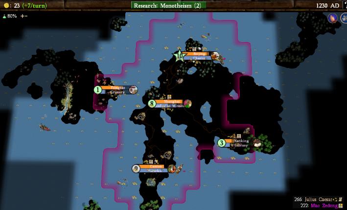 A new era opened in my civ's history in 1200AD when I discovered Astronomy and could start moving my ships (and now units, d'oh!) across the oceans. I immediately founded a city on the western island, which I could have done a thousand years earlier if I had known, and sent some upgraded galleys -> galleons out into the oceans exploring. Found Caesar first to the south and got Open Borders going with him. He eventually converted to Daoism, which spread to his civ naturally. Here is a map from the end of one of my playing sessions, in 1230AD: