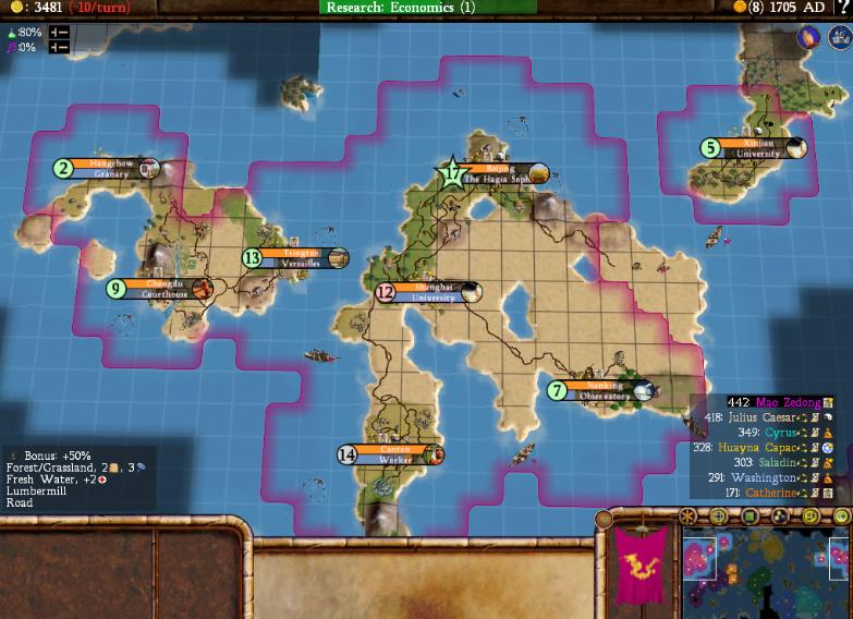 As far as the game goes, I did get a prophet for my second great person and used him to build the Confucian shrine, but my third attempt again failed (despite over 70% odds) and resulted in a merchant instead. As a result, I never built the Daoist shrine, but I did use that merchant for a trade route to Mecca in 1470AD that brought in 1700g. Then my fourth great person was another merchant, who I used for another trade route and 2500g in 1670AD. They let me run science at a fairly substantial deficit without worrying about going broke, so it all worked out.