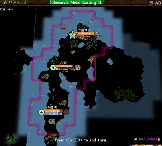One thing I DID do during these early AD years was to build the Colossus in Beijing. (I didn't have the half-cost benefit of that copper on the western island either.) While I didn't take things quite to the level of Fried's game, all I can say is that the wonder is EXTREMELY strong on archipelago maps. I'm not sure whether it needs to be nerfed or not, since in turn it can be all but worthless on pangea maps. At least it now obsoletes (I don't want to think about what it would have been like before that). When combined with a financial civ too - yikes. At the very least, the AI should emphasize building wonders like the Colossus and Great Lighthouse on archipelago maps. Is it possible to write different AI scripting for different map types? The Civ3 AI was notoriously bad at handling archipelago maps, which led to tons of players "gaming the system" by ONLY playing archipelago maps on Deity/Sid. It would be great if we could teach it to play differently on different map settings, at least at the pangea/archipelago extremes.