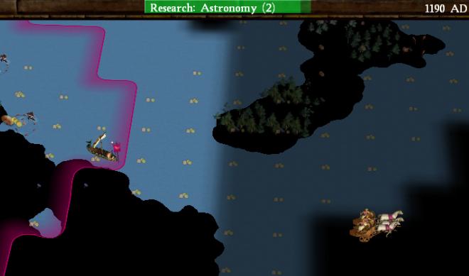 There's a humorous picture I want to slip in here; just before discovering Astronomy, I realized I could put units in galleys and loaded a chariot into one. I then unloaded the chariot onto the western island - moving across the International Date line in the process. Rather than move one tile west, the animation showed the chariot moving across the ENTIRE WORLD east!