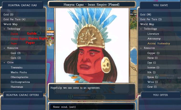 This was taken when I first met Huanya Capac in roughly 1300AD. Notice that he still hasn't researched Animal Husbandry yet - which would appear to be idiotic, except that the Inca had no resources that required it on their homeland. They simply took the other "OR" branch on the tree and kept right on going. At least in this one particular area, the AI clearly understands to skip resource techs it has no use for.