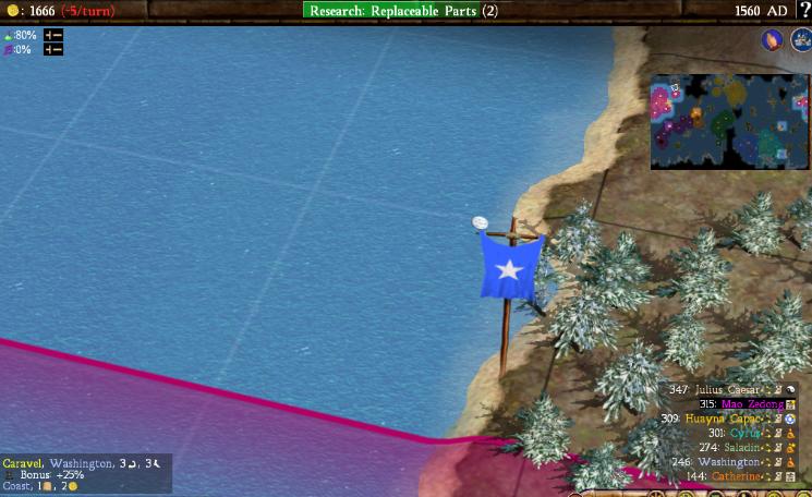 Do you see the American caravel? Units kept appearing in the wrong tiles all throughout this patch, but for this particular unit, it wasn't on the map AT ALL. Just the flag. I'm sure that this bug is well known and has already been fixed, but this picture was took good to pass up taking. Ditto for the following: