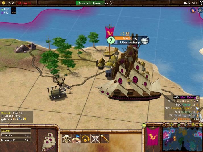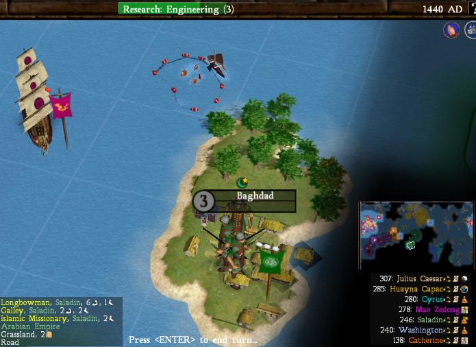 There's the Islamic holy city, a two-tile island off the southern coast of Arabia (and yes, I do like playing around in the free camera mode). That Islamic missionary isn't doing much good there. (The AI civs were expanding off their starting islands in this game, but only in galleys, not galleons.) The actual city of Baghdad is not that bad, since there are some sea resources near it, but it's not a great location for a holy city. I think any cure for this would be worse than the disease itself, but just bear in mind this IS going to happen from time to time. Then again, the real-world city of Mecca isn't exactly in the most fertile location either.
