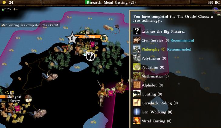 Continuing with the story, I realized in 600BC that no one had built the Oracle yet so I made a run after it with Beijing. To my shock, I actually managed to complete it at the very late date of 350BC and used it to grab a second religion for my civ: