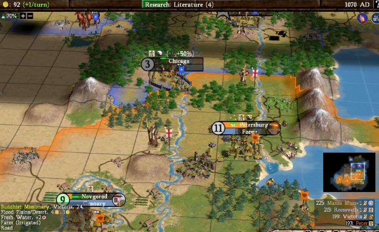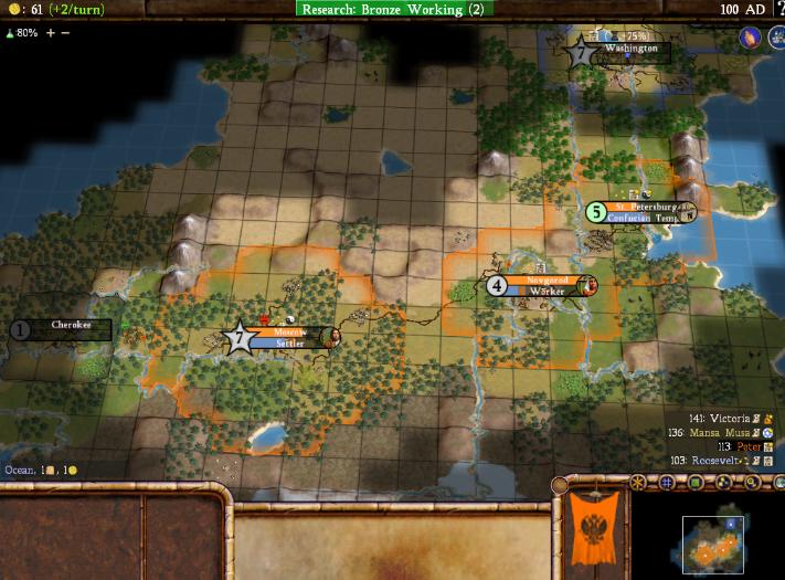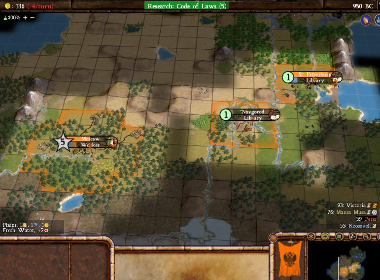 St. Petersburg was the real coup, practically a first-ring site for the Americans that I poached right out from under FDR's nose. There's corn, pigs, and wines located there, and the location is also a river and coastal city. It will clearly be a very strong city down the road. Novgorod is in some ways a space-filler, but also has ridiculous amounts of food. Four floodplains tiles plus a grasslands corn resource; those five tiles together when farmed would produce 21 food even before Biology! I think I have my spot for a Great Person factory, and that will fit well with Peter's leader traits.