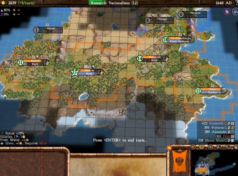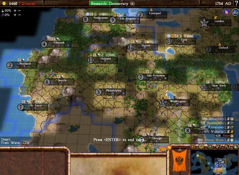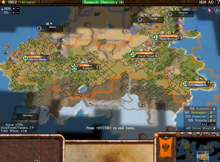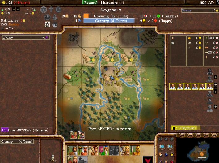 The other civic that I had an unexpected result from was Federal Reserve. With over 15,000g in the bank, I should have been reaping large benefits, right? Wrong. Sure, I could run 100% research with a slight profit (roughly 5-10gpt), but other than that it wasn't doing much. The big plus you see in the above screenshot is due to the wealth that Novgorod is pumping out, not due to the Federal Reserve civic. Even with this much gold in the bank, I was only getting 75g out of the civic, and that's just not a big enough deal to make the swap. And keep in mind that I conducted four trade missions of 2850, 4050, 4050, and 4050 gold (total of 15,000g) in this game, and still wasn't seeing a huge benefit. The problem with Federal Reserve is its exponential nature; either it's ridiculously overpowered (as I understand it was in some of the earlier builds) or it's toned down to the point where it contributes practically nothing. Either way, there's basically no middle ground. I see it's been scrapped in v.60 and I say good riddance. I just don't see any place where it could fit into the game without being too strong or too weak.