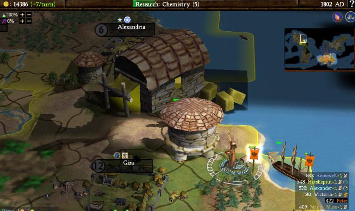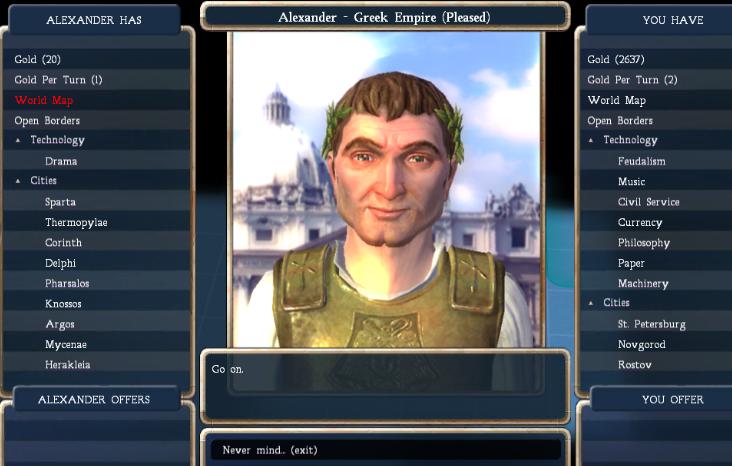 I had known there were two continents in this world since the minimap gets revealed when loading a save (uh, we might want to mix that bug soon). I wasn't able to get a ship over to the other continent and make contact until 1635AD, when I met Alex and Hatshepsut.