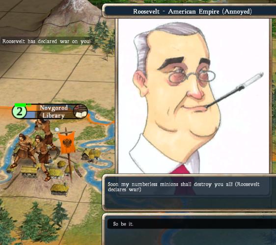 So everything was running along pretty smoothly in my cities. I had Moscow working on the Oracle to see if I could get it and grab Daoism (again, in a reprise of the move I used in my last game) and the other two cities were building up some basic infrastructure. I was neglecting defense quite a bit, but with FDR the only AI civ within striking distance, and him sharing my state religion and holding steady at "Pleased" relations, I wasn't exactly worried. So when this came out of the blue, I was a little... surprised: