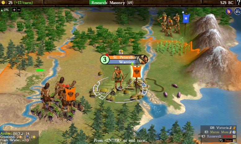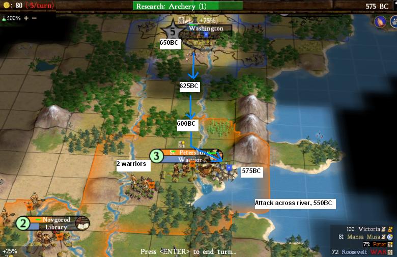 The picture is from 575BC, when I was 1 turn away from discovering Archery (and just barely! whew!) FDR's chariot was in Washington in 650BC, then started moving south. But look at the path it moved! In 600BC, instead of moving south and attacking St. Petersburg, it moved south, southeast across a river! and gave me an extra turn of reprieve. On the 575/550BC interturn, FDR's chariot attacked ACROSS THE RIVER and killed one of my two defending warriors. Now he probably fully expected to take the city on the next turn, but in 550BC I discovered Archery and upgraded my remaining warrior to an archer (oh thank heavens for that upgrade! and I only had the gold as a result of popping huts way back when!) who then defended the city in the 550/525BC interturn when the chariot attacked again. In the Big Huge Dice Roll (TM) that followed, I was successful... barely.