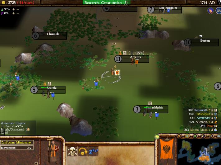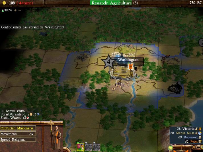 As you might guess from my determined beeline up the tech tree (I didn't even have Agriculture researched to hook up my corn!), I was the first one to discover Code of Laws and founded Confucianism in 825BC. St. Petersburg became the holy city. The free missionary now posed me with an interesting dilemma; take the obvious move and use him to convert Moscow, or send him north to the Americans (who had no religion of their own) and convert Washington to Confucianism. What ultimately made the decision for me was the fact that this whole game is a part of a testing process; since players are probably going to use the free missionary to convert their own cities 90% of the time, I might as well do something a little unorthodox and see what happens. So the free missionary went north and did indeed convert the Americans to my religion.