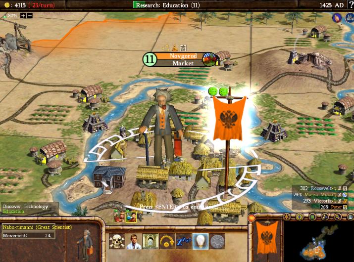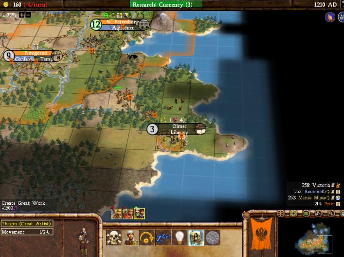 Alright, back to Novgorod again. This city had so much food that it was begging to be used as a Great Person factory. I was happy to oblige, and used (abused?) Caste System to great success here: