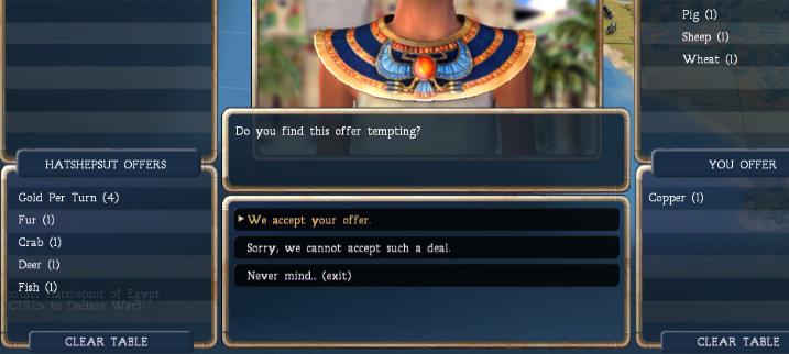 Wow, Hatshepsut really wants my copper, doesn't she? This is probably too much for the AI to give away for one strategic resource, and an outdated one like copper at that (we're about to enter the Industrial Age here). Two of those resources would probably be more than enough. It might be a good idea to make sure that the AI doesn't give away too much to get its hands on outdated strategic resources. In other matters, the AI is trading very intelligently; I made a number of tech deals in this game, but every time the AI was getting something just as good as I was picking up. The fact that the AI civs won't trade monopoly techs or ones for which they're building wonders makes the AI much stronger than it was in Civ3. As far as trading goes, the AI is performing quite well (other areas of AI diplomacy still need some work). The demands have also been reduced to a tolerable minimum, so good work on that as well.