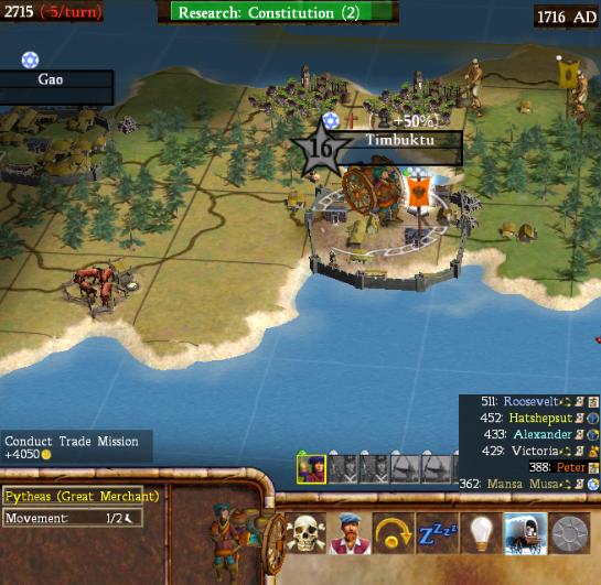 I had swapped over from running scientists in Novgorod to merchants, which allowed me to up the science rate to 90% and still get a slight profit. The other side effect from this was the generation of tons of Great Merchants, which are never a bad thing to have around (in the mid-to-late game, I think these may be the most valuable GPs). Here's a shot of one of them delivering his bundle of goods to the Malinese capital for a whopping payout: