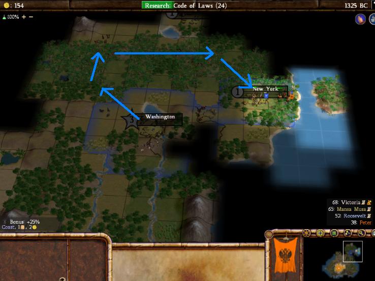 The arrows show the path that the settler took. Northwest out of the capital to where those horses are located, then straight east, then back south again to ultimately settle almost due east of the capital. Simply bizzare; the only explanation I could think of was that another AI civ had taken the location that FDR was going to settle (?) Regardless, there is room to improve things here. Also notice that I've met Victoria (who founded Buddhism) and just how long it's taking to research Code of Laws (it started at 39 turns!)