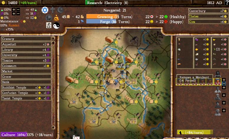 That's right - I'm running FOURTEEN merchants in Novgorod! They are paying for the entire upkeep of my civilization by themselves. Keep in mind, I DON'T have Wall Street built in this city (I can't build it with only five cities) and I also don't have the Heroic Epic here either - or else I would be getting 168 GP points/turn. Yikes. Again, I'm not calling for the out and out nerf on Caste System yet, just trying to illustrate that so long as it provides UNLIMITED specialists, players are going to find clever ways to make use of it. This is a little bit of an extreme example, but it's in there nonetheless, and I made use of it. I wonder if I could have gotten to 20 merchants by the end of the game if I had kept on playing? Probably, and it would have been fun to try.