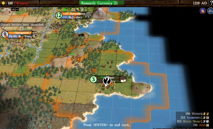 Novgorod naturally produced a GrScientist from all those specialists, which I used to build an Academy in St. Petes in 1150AD. After completing the Pyramids, Moscow built a barracks and 5 Axeman, who went after the barb city that would be my fifth and final city. It was 5 Axes (all with City Raider I) vs. 3 archers in a city behind walls; I only lost Axeman, but had several close battles. Olmec fell in 1210AD: