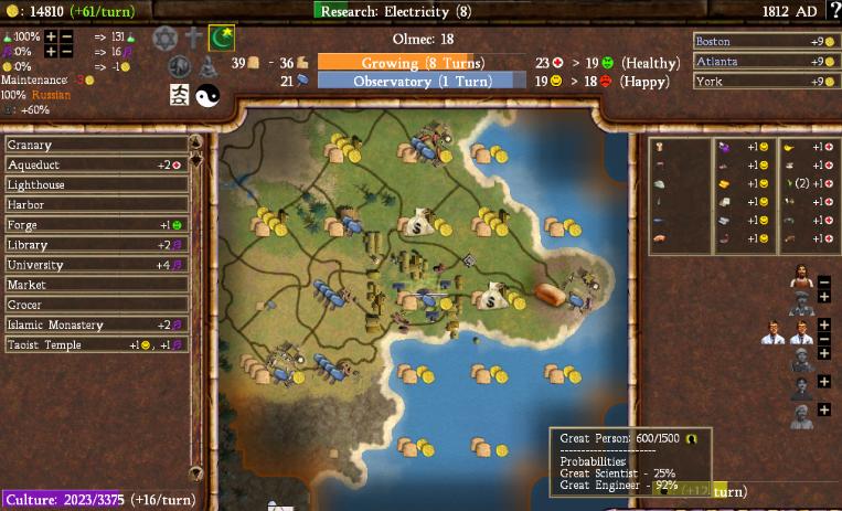 Great Person probabilities again not adding up; 92 + 25 = 117%, which would appear to be "fuzzy math". I also want to know how the city of Olmec can be producing NEGATIVE ONE gold per turn, but that's another matter entirely.