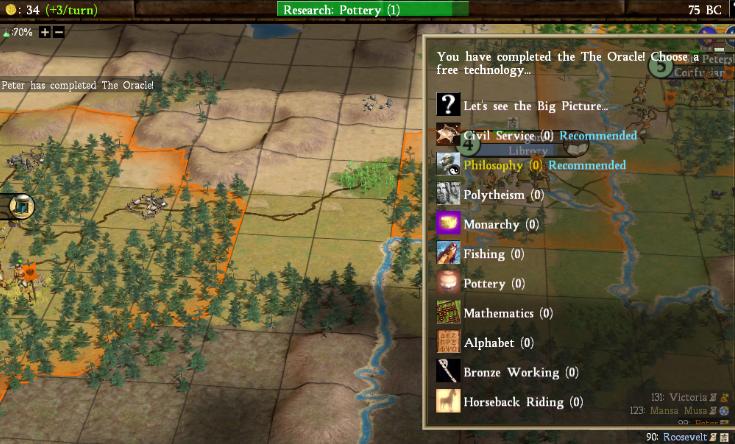 I stopped last time right after suviving an early war from FDR without losing any of my cities (lesson - build more defense than warriors next time!) I would never go to war again, so the rest of this game was a peaceful building exercise. That's pretty much what I wanted in a Five City Challenge game though! After getting out of that dangerous early war, I spent a while trying to rebuild the damage that American pillaging had done. Ordinarily it's pretty easy to repair lost tile improvements, but everything does take twice as long in these Epic games. Despite a happiness crunch in several cities from losing my wines, Moscow was able to go back to building the Oracle and complete it in 75BC: