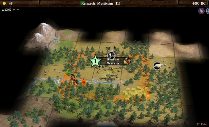 After moving the scout first, I decided to move the settler one tile southwest, which allowed me to still settle in 4000BC on the first turn. You can see this in the picture above; also notice that the resource pointer only identified resources that were present on the screen when it was turned on; the sheep resource to the west was in the fog when I turned it on and thus is not identified. The corn and silks in the south too, for that matter. This probably needs to be fixed to avoid confusion. Initial research choice was Mysticism to pursue a religion; I figured that as a non-Spiritual civ I would probably have to settle for Confucianism again, but might as well start out moving in that direction. Initial build was, not surprisingly, a warrior.
