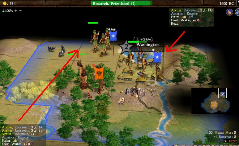 The AI has just produced a settler and is now sending it out with an escort of two archers; this is all well and good. But the city of Washington, the capital of the whole civ, is only being defended by ONE ARCHER because those two have gone out with the settler! Can you say "exploitable AI pattern"? Now I only have one warrior in place here, and am in no position to attack, but it would be very easy to have several archers (or chariots, if there are horses near the starting position, or maybe even horse archers) outside the AI capital waiting for just such a decapitation strike. This MUST be fixed; the AI civs cannot cripple the defense of their capitals when producing a new settler. Red flags all over the place on this particular move.