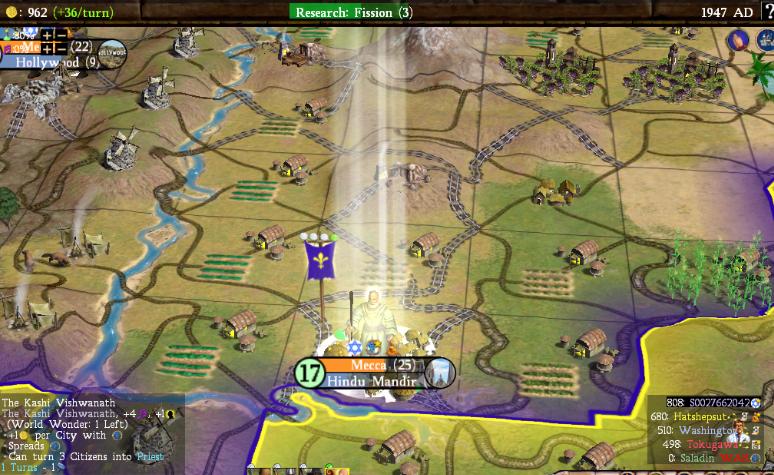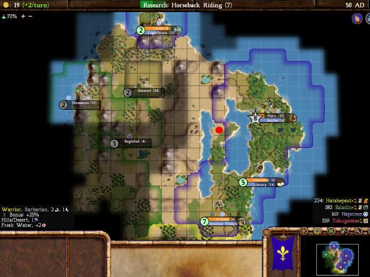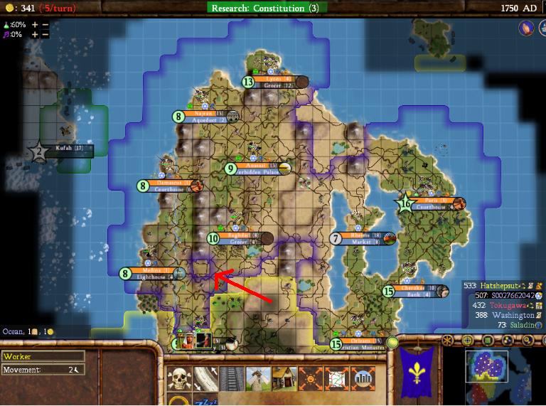 The red dot is where the settler in production will end up going. I would eventually conquer Anasazi as well, which would be only my third decent city after Paris and Orleans. Everything else was basically a glorified fishing village. The Arabs to the west had much stronger land, but even they paled in comparison to Egypt to the south. Tokugawa had a tundra furs "unter-start", so Hatshesut had tons of room to expand and took advantage of it. Egypt ended up founding Buddhism/Christianity/Daoism/Islam and already at this point was becoming the runaway AI. The endgame replay revealed that Hatshepsut would end up building 13 wonders - 13! All of the other AIs together only built 6. It's tough to stare down that kind of competition, especially with this kind of land.