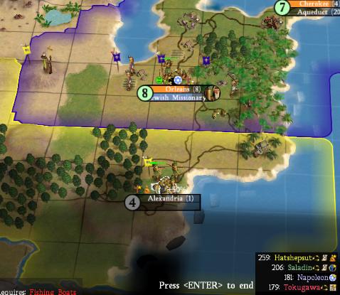 More bad luck regarding Egypt. Orleans was my second city, and it built an obelisk immediately, then a library shortly thereafter. It clearly should have had the edge over any city founded later. Well, the Egyptians stuck a little city called Alexandria near it, which pleased me because there was a decent chance it might flip to my civ. Wouldn't you know it, Alexandria wound up becoming the Christian Holy City, and with that culture plus the Christian Shrine (which Egypt easily put there, thanks to the Great Person points from their tons of wonders), Orleans had its borders pushed back.