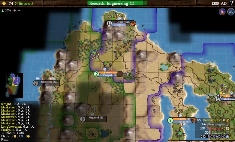 With the land that I had, I considered my chances of catching up to a runaway AI civ to be next to none. Therefore, the only option was to attack someone, and strategically the best choice for that was Saladin. I figured that with control of his lands and mine, I would be in a strong position to win the game. As a result, I beelined up the tech tree on the Metals branch, aiming specifically for Gunpowder and my musketeers. As Aggressive Napoleon, they would get a free Combat I, and with Feudalism and Vassalage kicked in, I could add two more promotions onto that. Combat I and II + Cover would give me a +45% strength against the Longbows I expected to face, which I considered to be some pretty good odds. Anasazi, taken from the barbs in 1060AD, was the staging area for the opeeration. Gunpowder was discovered in 1220AD and I began preparing for my musketeer crusade. The entire war would basically be fought with musketeers from Paris and Orleans, but I expected that to be enough. Anasazi could kick in the cats I would need as well. Here was the situation on the turn that I declared war in 1380AD: