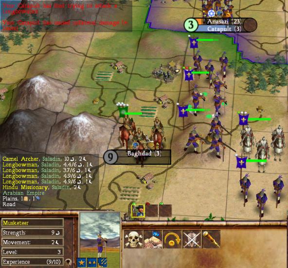 Here's the battle around Baghdad. The red text at the top doesn't come out well when converted to a jpeg file, but I've moused-over the collateral damage that my catapult did when attacking. Load up the cats with some collateral damage boosters, and they really dish out some punishment (even if they themselves get killed). I also wanted to get a shot with all of my musketeers standing around for good measure.