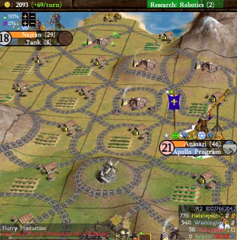 Alright, so I complete the Program in 1979AD; Egypt is now significantly ahead of me on the spaceship, so I need to do something to speed up the construction of the parts (my cities are generally shield-poor still). I revolted to Bureaucracy so that I could cash-rush the parts! A sure winning strategy, I will once again pull out a close one from the AI... oh no, the spaceship parts are also considered "Projects" and can't be rushed because they aren't considered to be buildings! ARRGGHHH!