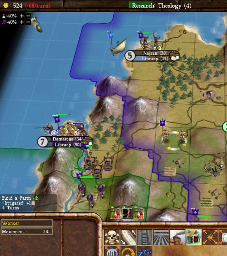 One bug I wanted to point out here. After taking Baghdad, I tried to spread farms up to Anasazi, which needed irrigation quite badly. For no clear reason, however, the game would not let me do this, as can be seen in the above shot. The farm picture is NOT simply grayed out (as happens often), it just won't let me build one. And I do have Civil Service at this point; I had just researched it for exactly this point! Later on, this problem simply disappeared on its own. Could it be that the game checks to see if you culturally control the source of the fresh water before allowing you to spread irrigation? I may not have had the oasis that this irrigation came from in my borders at the time. If that was the case, then it would be nice to have a message explaining "you do not have fresh water to spread irrigation" when mousing-over the grayed-out farm picture. I think I have a pretty good handle on this game now, and it still throws stuff like this that confuses me at times. I hate to think what would go through the minds of casual newcomers.