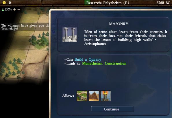 Masonry from a hut! This ensured that even if I failed to get Polytheism, I would definitely be able to snag Monotheism and Judaism. As it turned out, I would lost the race to Hinduism by 1 turn, but would go on to found Judaism instead. Definitely a big help there. I also popped Fishing from a hut in 3600BC and swapped Paris onto Work Boat. Another hot popped hostiles and ate my warrior, but on the whole I had very good luck (especially considering these were popped with warriors and not scouts).