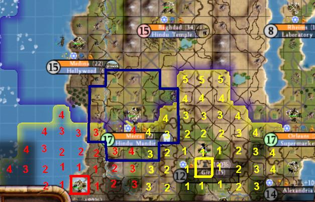 I'd like to make some suggestions here, but first I'd like to know what the actual formula is for determining which city gets a tile when two opposing cities' cultures are battling for it. One thing that seems to make sense would be to divide the city's culture by what ring the tile is in and then compare the two of them. For example: the yellow "4" east of Mecca is 1st ring for Mecca and 4th ring for Giza. To find out who gets control of the tile, we could divide each city's culture rating by the cultural level (1 for Mecca's first ring, 500 for Giza's 4th ring) and then compare the two numbers to see which is higher. Obviously in this case it would be Mecca, because Giza doesn't have 500 times Mecca's culture!
