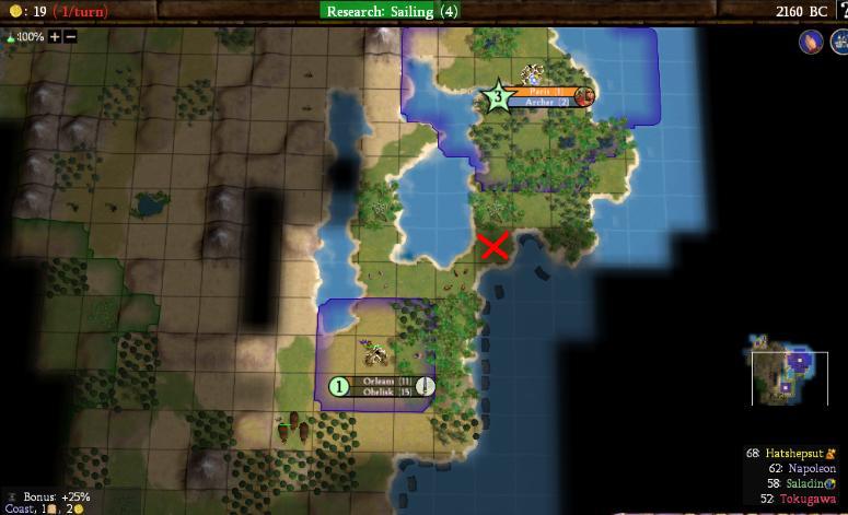 This is not the most promising situation. You can see where Saladin's capital is located to the west, and Egypt's capital is just a little bit to the south of Orleans out of view. I have Orleans building an Obelisk, because once its cultural borders expand it will block off all access to my lands from the south. This wasn't as big a coup as I expected though, since my nearby lands were so poor that no one wanted them. I did have horses and pigs at Orleans, but otherwise everything was a Calendar resource. Silks, dyes, sugar, incense - I had them all on my little finger of land - and nothing else in the way of resources. The red "X" is where a barb city popped up literally a turn or two after this picture; I was going to put a city there anyway, so I conquered it and added it to my territory. And after that spot... umm, where to expand next? The prospects were not good.
