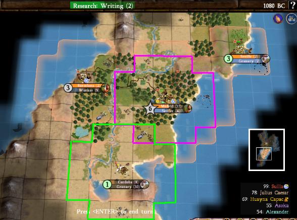 Madrid finished its settler in 1160BC and went onto yet another settler. Why not? Plenty of land and I still didn't have the techs to build libraries or forges or lighthouses. Monarchy was discovered in 1120BC, Hereditary Rule swapped to (beefing up Madrid considerably), and Writing pursued to finally get some libraries up and running. Cordoba was founded in 1080BC, and here's what it looked like: