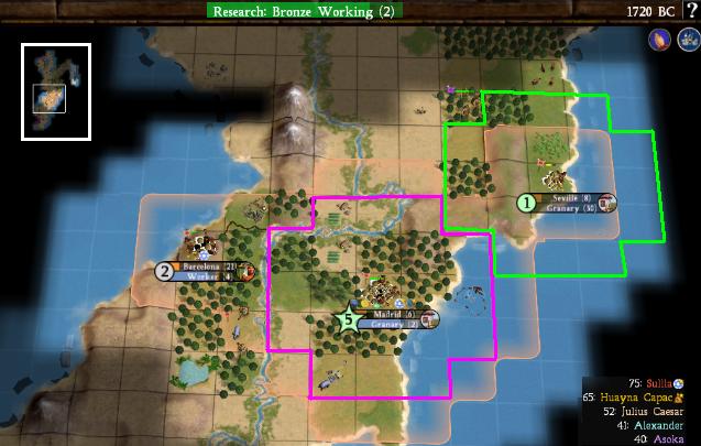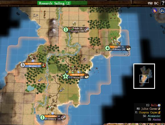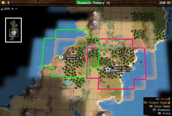 I've explored far beyond what you can see (check the minimap), but this is the only important area at the moment. Madrid is working on another settler and Barcelona is building its warrior escort (with the improved barbs in Civ4, you don't want to be sending out unescorted settlers!) The most important question is probably why did I put Barcelona where I did. Well, for starters, despite how it might appear, the city only overlaps 2 tiles with Madrid, as I've illustrated above. It's also by far the best place to put a city on the western coast; I considered a number of different spots and they all ended up with much worse land. Barcelona also will have two strong tiles right off the bat - a grassland cows (4 food!) and a plains ivory (3 shields!) Together with some of the grassland forests, that's all it will be need to be a good ancient-era city. Down the road, it will be able to mine the desert hills and use them for shields and build a lighthouse and work all those sea tiles for commerce. It also does one other hugely important thing: combined with Madrid, the cultural borders of Barcelona completely cut off the peninsula. No AI unit can pass through my territory without Open Borders, so I can prevent the AIs to the north from ever meeting Caesar to the south before boats if I want to! So despite how it might appear, this is a strong city site and will be a great second city to supplement what Madrid is doing.
