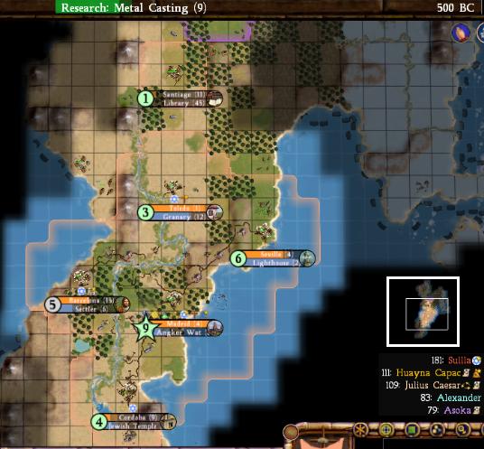 Barcelona and Toledo became the holy cities, and with luck one day I would be able to build shrines in both of them. Madrid, meanwhile, had gone over to building Stonehenge, which I could get in a mere 6 turns thanks to my stone resource. I finished that wonder in 525BC, and Madrid began building Angkor Wat, which could be finished in only 7 turns thanks to the stone half-discount. This is almost too easy! By this point, I had blown so far past the AI civs that I was no longer taking super-close notes. The next city to be founded was Santiago in 500BC, and I'll post the map from that date.